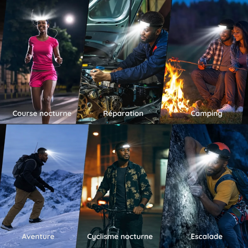 🔦 Éclairage ultra-puissant 230° COB — Avec ses 450 lumens et son faisceau large de 230°, vous illuminez toute la zone devant vous sans bouger la tête. Vous voyez tout clairement jusqu'à 107 mètres de distance. C'est comme avoir un projecteur portable sur votre front.