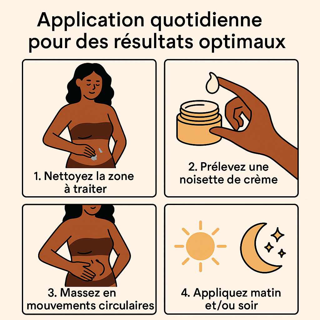 💡 Astuce pro : Insistez sur les zones de vergetures avec des massages fermes pour stimuler la microcirculation.