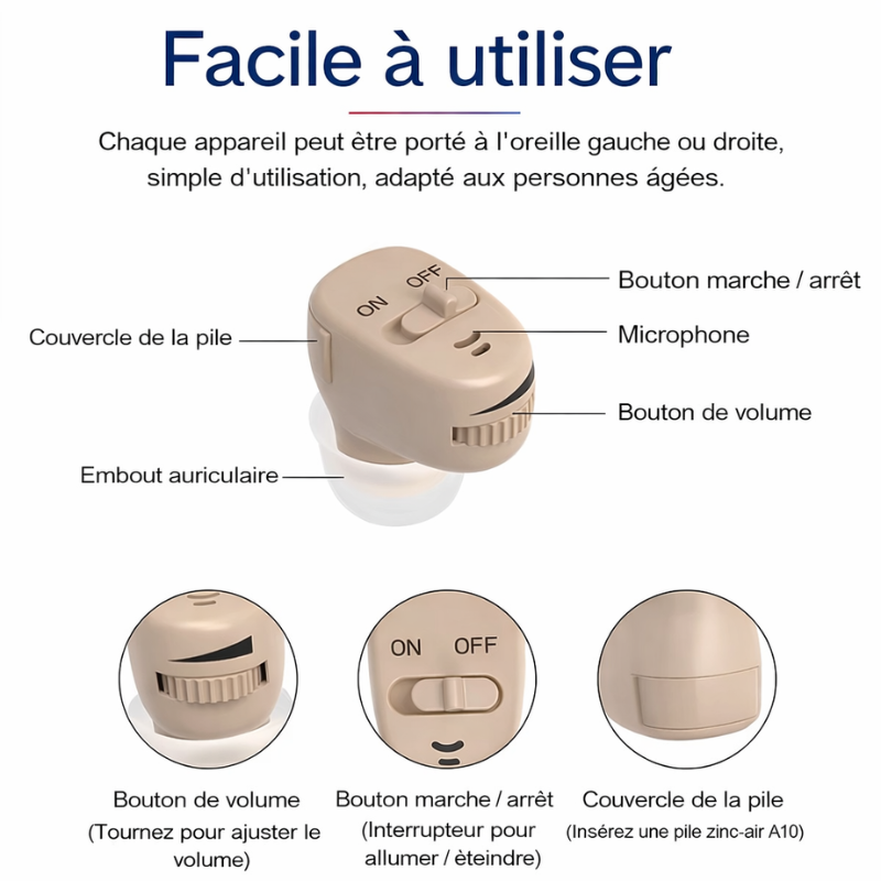Cette aide auditive utilise une puce intelligente d'amplification sonore qui analyse en temps réel les fréquences vocales (300Hz à 3200Hz). Elle amplifie sélectivement la parole humaine tout en réduisant les bruits parasites.